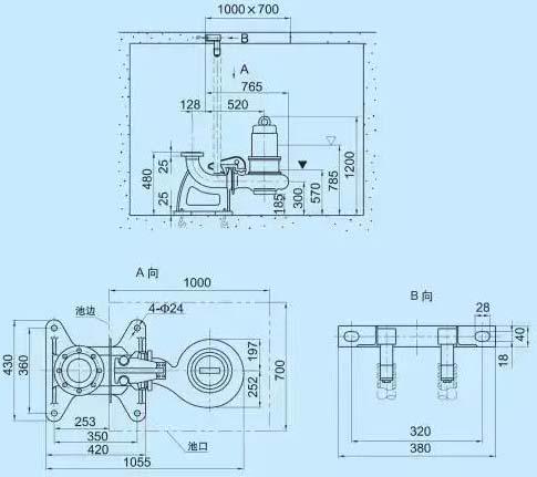 潛水泵耦合式安裝時(shí),平面的開(kāi)孔需考慮潛水泵的安裝尺寸。案例中A向視圖表示了水泵的安裝孔的大小尺寸,1000×700mm